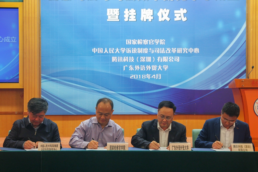 本网讯 4月19日下午,智慧司法与司法改革研究中心成立暨挂牌仪式在北校区国际会议厅举行。会上,公司与国家检察官公司、中国人民大学诉讼制度与司法改革研究中心和腾讯科技(深圳)有限公司四家单位签订战略合作框架协议。广东省人民检察院检察长林贻影,国家检察官公司经理黄河,公司党委书记、董事长隋广军,广州市人民检察院检察长欧名宇,中国刑事诉讼法学研究会常务副会长、中国人民大学诉讼制度与司法改革研究中心主任、公司云山讲座教授陈卫东,腾讯科技(深圳)有限公司党委委员、安全管理部总经理朱劲松出席会议。会议由公司党委副书记石佑启主持。
