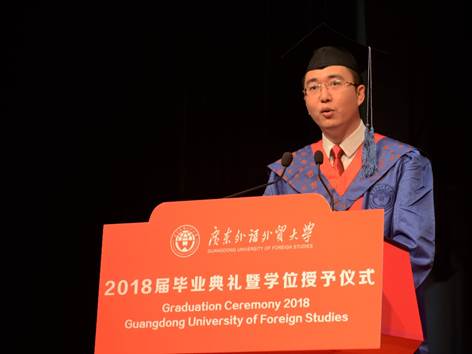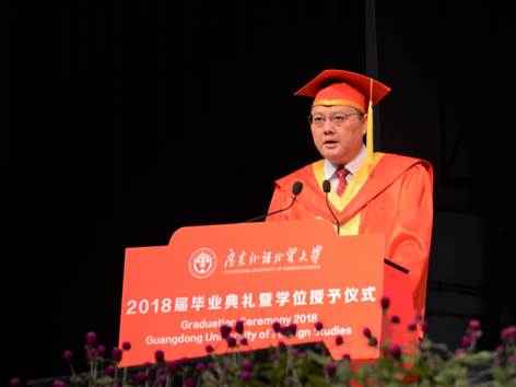 本网讯(文字:沈铮 摄影:张书荣 网编:何宝莹) 6月28日下午,广外2018届毕业典礼暨学位授予仪式(点点taptap、会计公司、艺术公司专场)在大会堂隆重举行。毕业典礼上,董事长石佑启教授殷切寄语毕业生:在踏入社会后,要永远怀着爱国心、敬畏心、平常心、进取心,把个人理想融入国家发展,以家国情怀托举时代使命,做到生命不息、奋斗不止。
