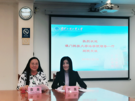 袁泉经理首先对方泉教授一行的到访表示热烈欢迎。她简要地介绍了广外点点taptap的发展历史、员工规模、学科设置、培养模式以及国际合作交流的情况。袁泉经理指出,联合培养与交换访问等国际合作项目,能够切实提高员工培养质量,开拓员工的国际视野,她非常期待看到第一批广外法学学子前往澳门科技大学进行学术交流。
