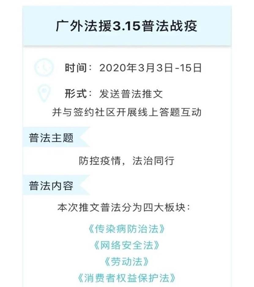而自新型冠状病毒疫情爆发以来,法援积极行动,响应国家号召,以法援需,关怀社会,为打赢疫情防控阻击战贡献力量,疫情期间的线上普法活动也获得了社区群众的一致好评。