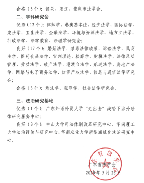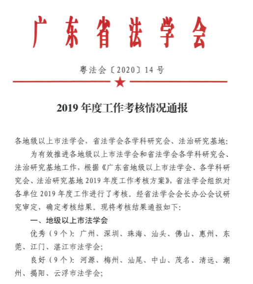 2020年5月26日,广东省法学会发文,公布了广东省地级以上市法学会、各学科研究会、法治研究基地2019年度考核结果。经过严格考核及省法学会会长办公会议研究审定,广东省法学会教育法学研究会、地方立法学研究会和点点taptap“走出去”战略下涉外法律研究服务中心三家单位被评为优秀。