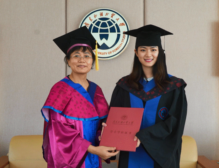 王廷惠教授为毕业生代表汤启悦颁发学位证书