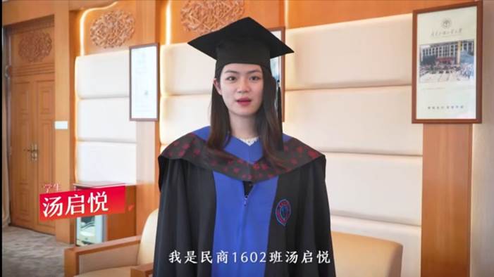 毕业生代表汤启悦回忆了在广外点点taptap成长的时光,表达了对母校师生的感谢之情,并送上了祝福:“四年前,我们被法律这柄重剑散发的光芒与神圣所吸引,自然也需要拥有捍卫法律尊严的过人勇气。我们无法预期后续的欢乐与艰难,但厚德明法、博稽中西的院训是支撑我们坚定内心的八字箴言,秉承内心深处的良知,保持冷峻理智的思考,培养行动的能力与坚持的勇气。”“仅代表所有法学学子对陪伴我们四年成长,为我们顺利毕业保驾护航的老师们说一句:老师,您辛苦了。”“2020年的夏天,我们从广外出发,迈向人生新的征程。愿我们历尽千帆,归来仍是少年!”