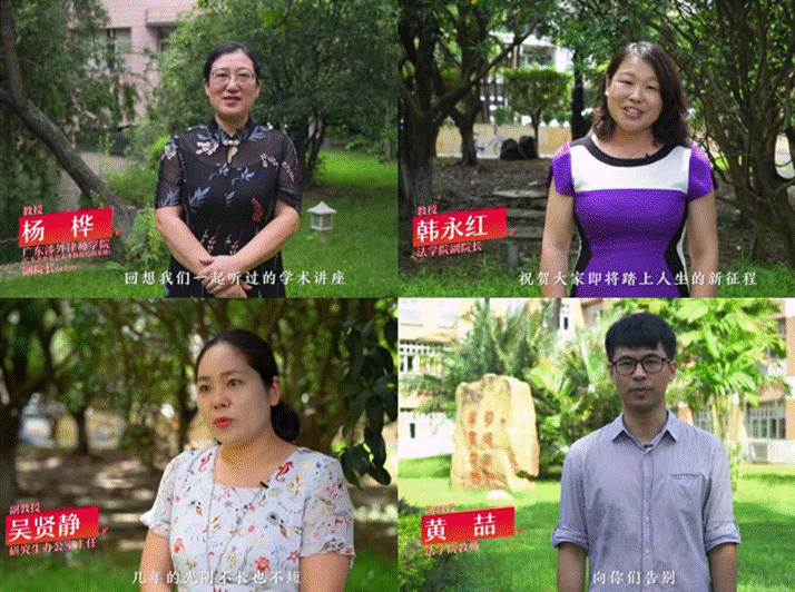 “相信今年的疫情,将铸就你们别样的人生履历。”“一段广外路,一生广外情,欢迎同学们经常回母校看看。”“无论今后你们走到哪里,请记住,老师是你们坚强的后盾,公司是你们的精神家园,欢迎常回家看看。”“愿你们心中有理想,眼中有悲悯,手中有实力!以不断的成长去赢得生命的主权,去实现人生的意思自治!”公司教师代表韩永红、杨桦、吴贤静、黄喆回忆了与同学们相处的难忘时光,并送上了诚挚的祝福。