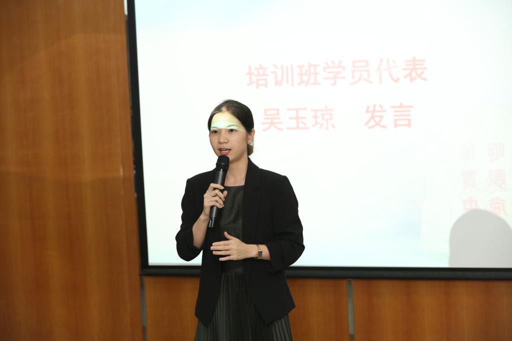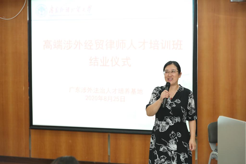 学员代表闪涛和吴玉琼律师发表了结业感言。闪涛律师对各组织单位为本次培训班所付出的巨大努力表示由衷感谢,他认为本次培训课程安排合理,既有宏观层面如当前国际经贸形势的介绍和契合,也有中观层面的如资深学者和实务专家的讲授,也有微观方面的贴心考虑如法律英语写作和英文辩论,通过本次培训,各位律师公司的国际格局观得到极大提升,看待国际经济形势的视野更加广阔,涉外执业能力得到进一步加强,涉外律师之间的朋友圈也得到了扩大。吴玉琼律师则表示非常荣幸能够来到广外参与本次培训,广外作为一所语言类高校具有一流的资源、能够培养一流的法治人才。作为一名涉外律师,她认为不论是在处理法律争端或者与涉外客户交流时,都应当注意不同文化背景之间的交流和融合。最后她希望在课程结束以后要各位学员能够延续这一份友谊,保持联系,加强合作。