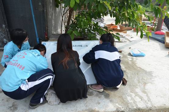 志愿者为流浪动物爱心之家制作宣传板