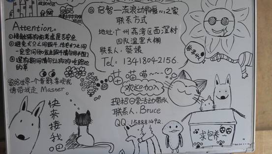 由于本次参与活动人数较多, 而蔡姨平常要照顾猫狗已经非常辛苦,根本没时间进行大清扫,因此志愿者们决定展开大扫除,不仅按原计划进行了扫地,洗地,遛狗,打扫猫舍狗舍等活动,还清洗了猫笼,狗笼里的物品,并制作了新的宣传板。