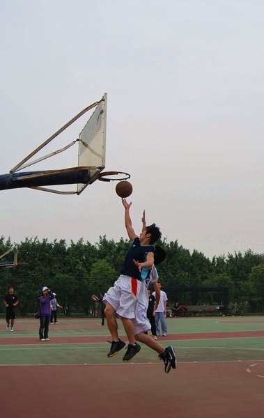 开场哨音一落,07法二迅即取得控球权,32号任相宇带球上篮,2分进账!08法五也不甘示弱,随即快攻反击,把比分追平。气势大增的08法五凭借队员间的默契配合和多变的战术拉大分差。但07法二根据08法五的战术特点,还以颜色,致使法五一度陷入得分荒。特别是07法二的8号黄志坚和5号张桐枫,屡屡快攻,为法二追平比分。场上十分激烈,而场外观众不时为球员们加油助威,不时为双方精准的投球大喊:“漂亮!”