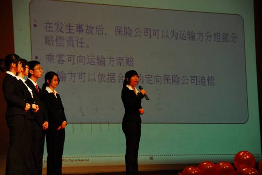 本网讯(记者:文字:吴丹妍 摄影:方少杰) 2010年4月13日晚上7点,第四届“与法同行”调研大赛总决赛在南校区员工活动中心隆重举行。法公司党委副书记卢海清、团委书记郭嫄莅临现场,评委由范利平教授、朱晔教授、常廷彬副教授、修文辉老师及陈胜老师担任。5支决赛队伍本着务实求真的精神,对身边现存的现象进行了系统的研究与调查。